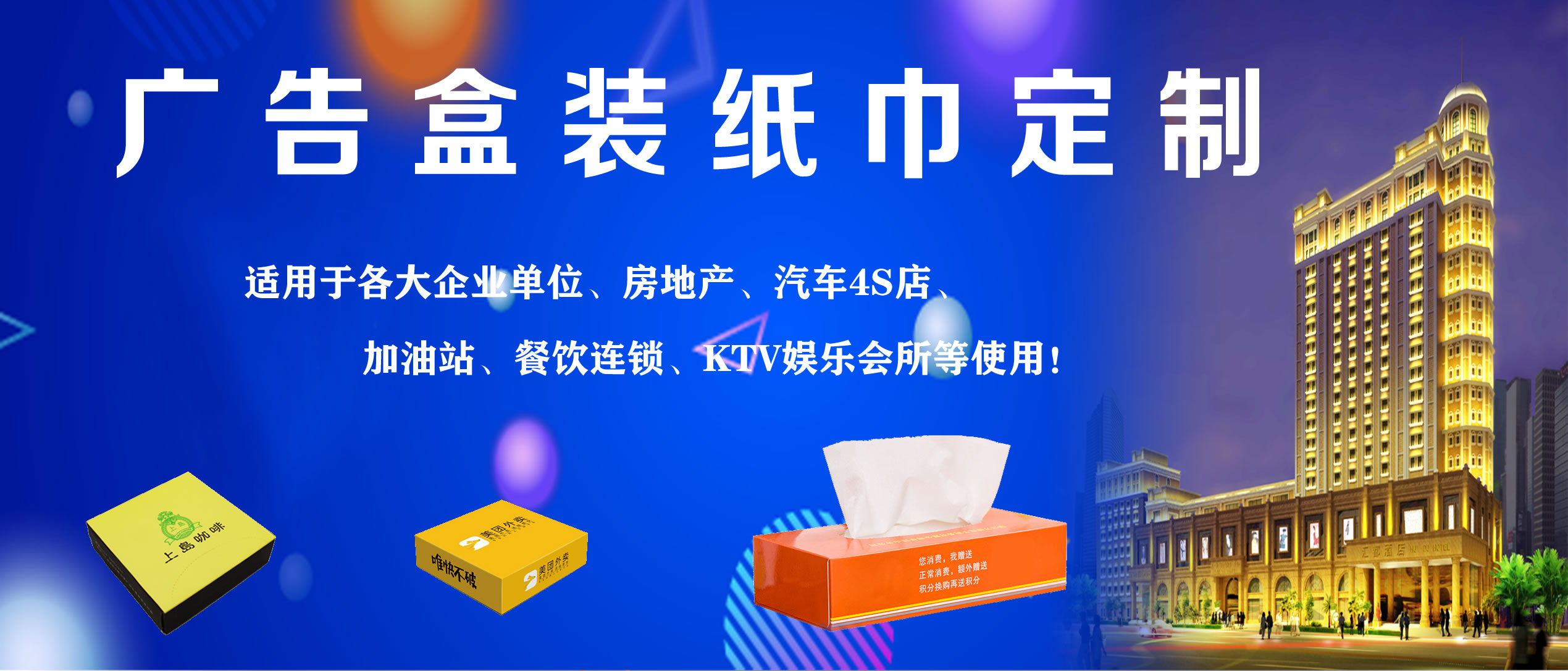 合肥億竹紙品包裝有限公司是一家專業(yè)從事各種生活用品定制的企業(yè),定制熱線:18919603840(周經(jīng)理)。公司與各大餐飲行業(yè)、酒店、加油站、學(xué)校、KTV娛樂(lè)會(huì)所、銀行、汽車(chē)4S店、房地產(chǎn)、廣告公司等客戶長(zhǎng)期合作,業(yè)務(wù)覆蓋安徽全省。公司主營(yíng)產(chǎn)品:廣告盒抽定制、餐巾紙定制、大盤(pán)紙、擦手紙、散抽紙等。有著完善的生產(chǎn)硬件設(shè)備和專業(yè)技術(shù),及長(zhǎng)期從事的豐富經(jīng)驗(yàn)。 我廠專注生活用品多年,致力于生產(chǎn)“精致,高端,綠色,健康”于一體的優(yōu)質(zhì)產(chǎn)品,以誠(chéng)信、實(shí)力和產(chǎn)品質(zhì)量獲得業(yè)界的認(rèn)可。目前我廠產(chǎn)品已深得寶馬汽車(chē)、重慶劉一手火鍋餐飲連鎖、萬(wàn)達(dá)集團(tuán)、綠地集團(tuán)等眾多客戶的青睞,業(yè)務(wù)量不斷攀升。